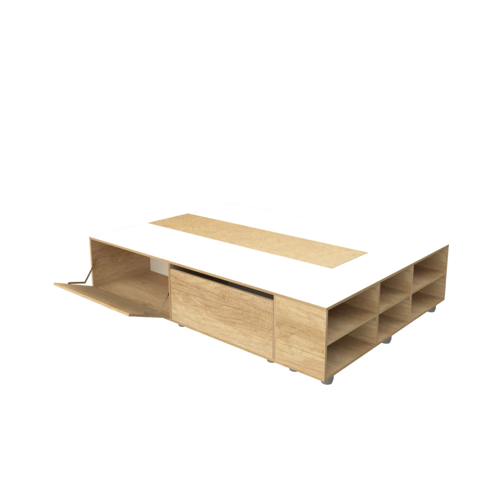 Con dimensiones de 191 × 141 × 40 cm y un peso de 88 kg, cuenta con cuatro puertas basculantes laterales y estantes en la piecera que facilitan un almacenamiento organizado y accesible. Su diseño elegante en Roble Kendal Natural aporta calidez y sofisticación a cualquier ambiente.