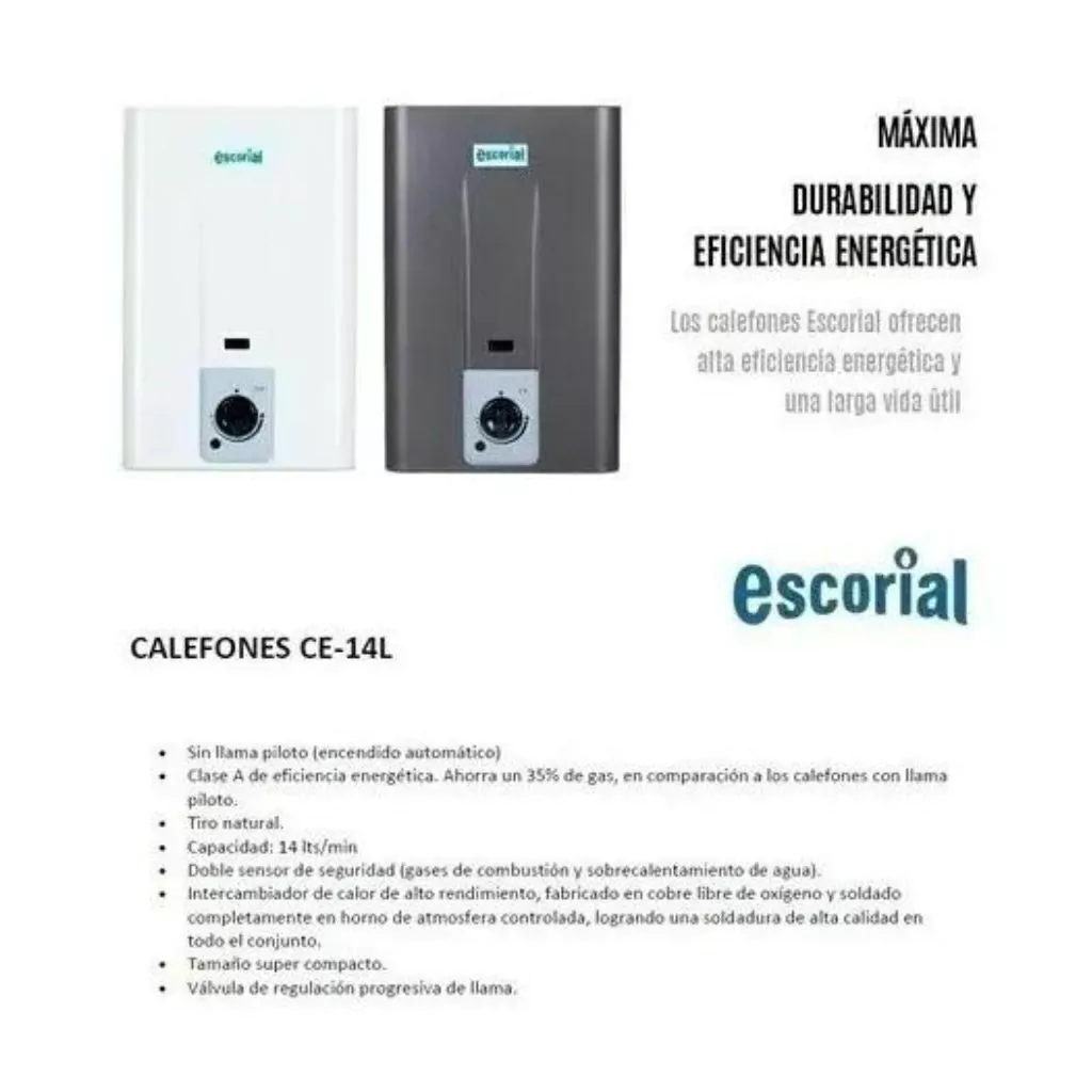 Elegí seguridad, eficiencia y diseño moderno con el Calefón Escorial 14Lts, el aliado perfecto para tu confort diario en Argentina.