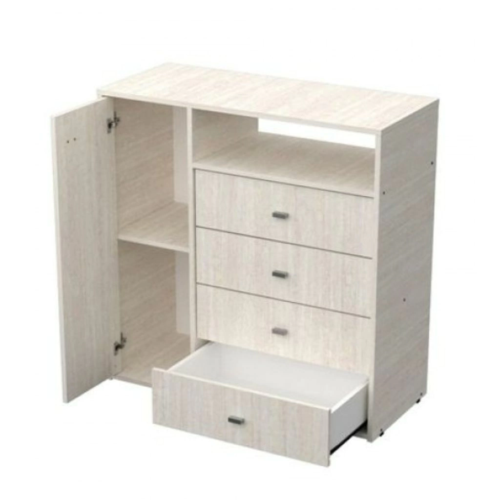 Con sus medidas compactas (91 cm de alto, 90 cm de ancho y 38 cm de profundidad), es ideal para cualquier habitación. Cuenta con 1 puerta batiente y 4 cajones con correderas metálicas, que garantizan un deslizamiento suave y seguro. Los tiradores de plástico complementan su diseño funcional.