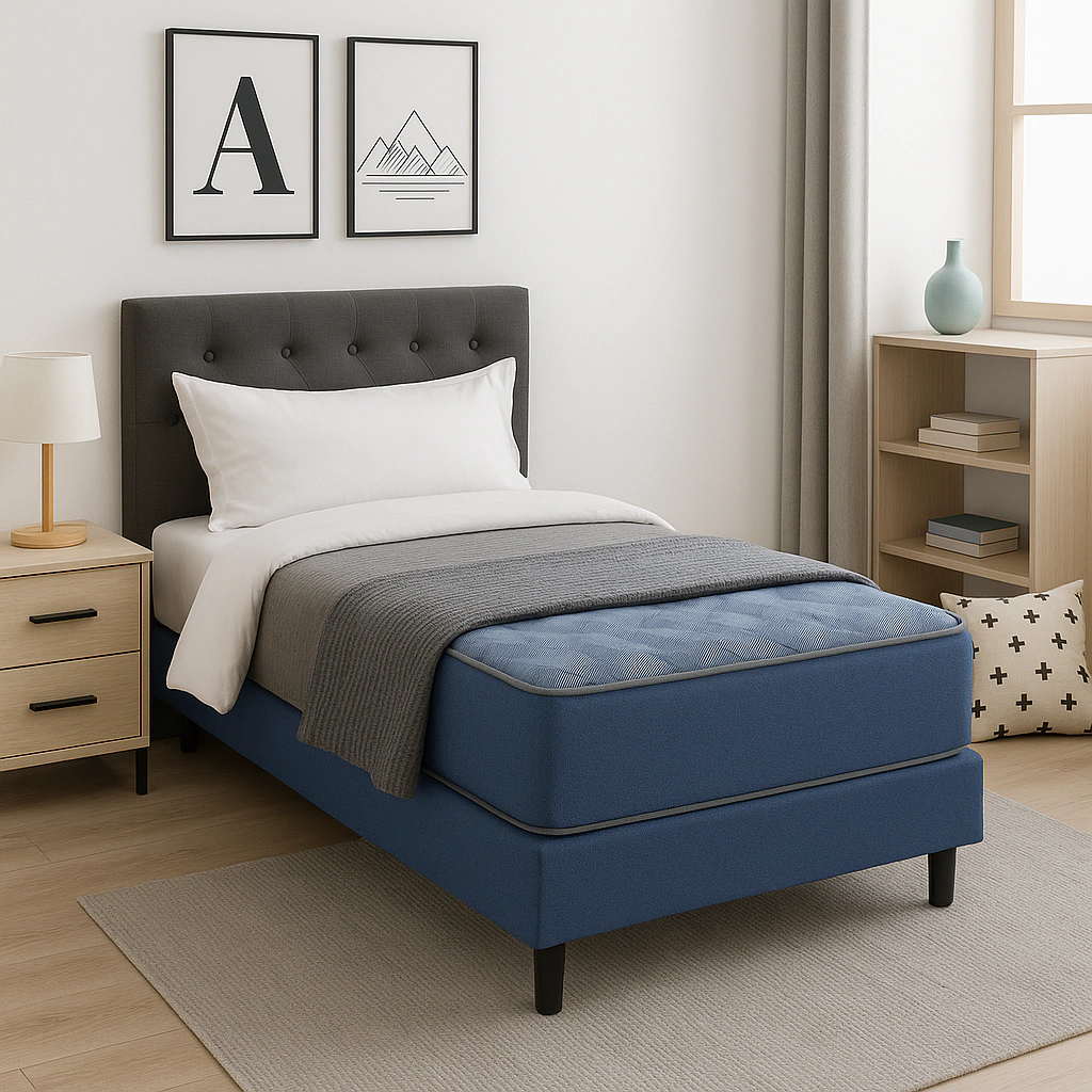 Descubrí el Conjunto Sommier Consular Maxiking Espuma 80 cm + Base Consular 80 cm, la solución ideal para un descanso confortable y elegante. Con un colchón de espuma de alta densidad 24 kg/m³ y tela Jackard en un sofisticado tono azul, este conjunto ofrece firmeza y suavidad en cada noche.