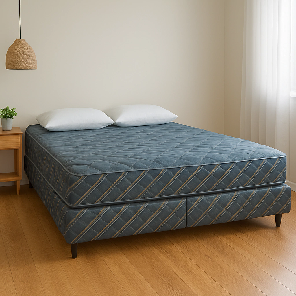 Descubrí el máximo confort y elegancia para tu descanso con este conjunto sommier de alta densidad. Con sus 28 kg de espuma de alta densidad, garantiza una firmeza y durabilidad excepcionales que sostienen tu cuerpo de manera óptima.