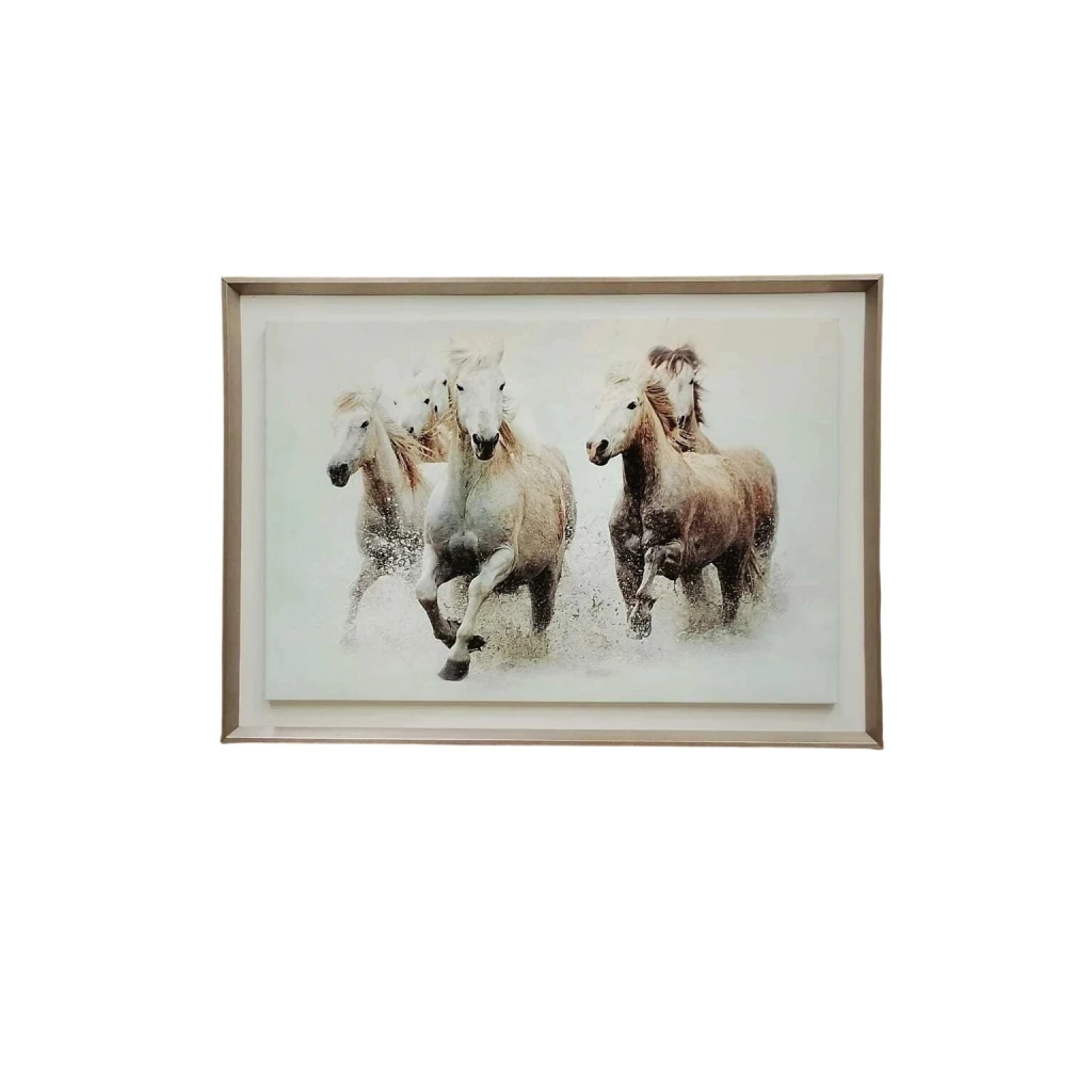 El marco plateado realza la imagen de los caballos, transmitiendo dinamismo y libertad, mientras que su acabado pulido aporta un toque moderno y refinado. Perfecto para quienes buscan decorar con estilo y personalidad, este cuadro es una excelente opción para renovar la decoración con un detalle que cautiva.