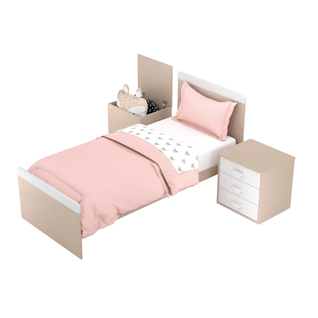 Esta cuna convertible se transforma fácilmente en una cama de 1 plaza, una práctica mesa de luz y una baulera, adaptándose a tus necesidades y optimizando el espacio. Las barandas son deslizables y desmontables, y los cajones cuentan con correderas metálicas telescópicas para un uso seguro y cómodo.