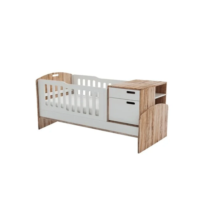 Esta cuna se destaca por su estructura robusta de melamina texturada de 18 mm, que garantiza durabilidad y resistencia. Sus barandas extraíbles de MDF laqueado facilitan el acceso y brindan seguridad. Además, cuenta con prácticos cajones y puertas en MDF laqueado, equipados con guías metálicas y bisagras articuladas para un uso cómodo y silencioso.