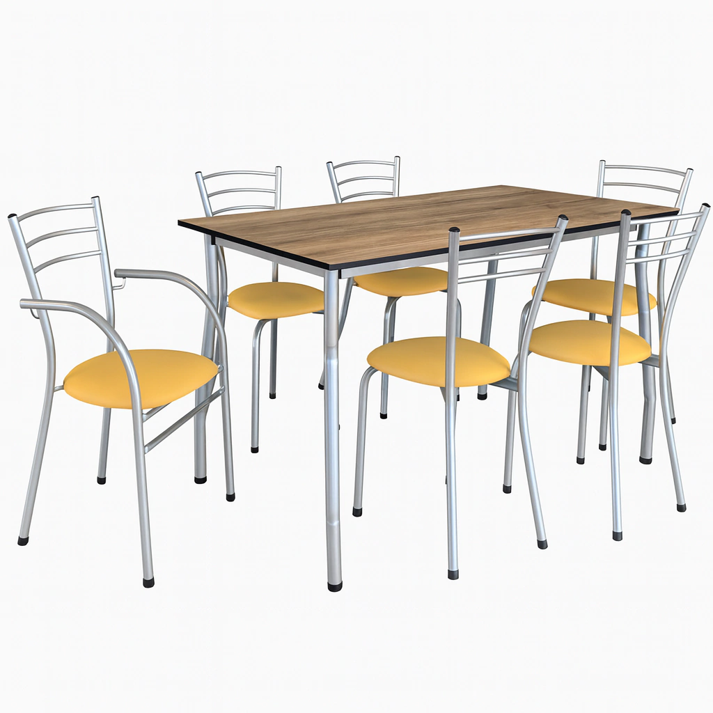 Transformá tu espacio con el Juego de Comedor Génova, que incluye una mesa de melamina de 140x80 cm con base de caño gris de 1,1/2", acompañada por 4 sillas y 2 sillones con estructura de caño de 1" en el mismo tono.