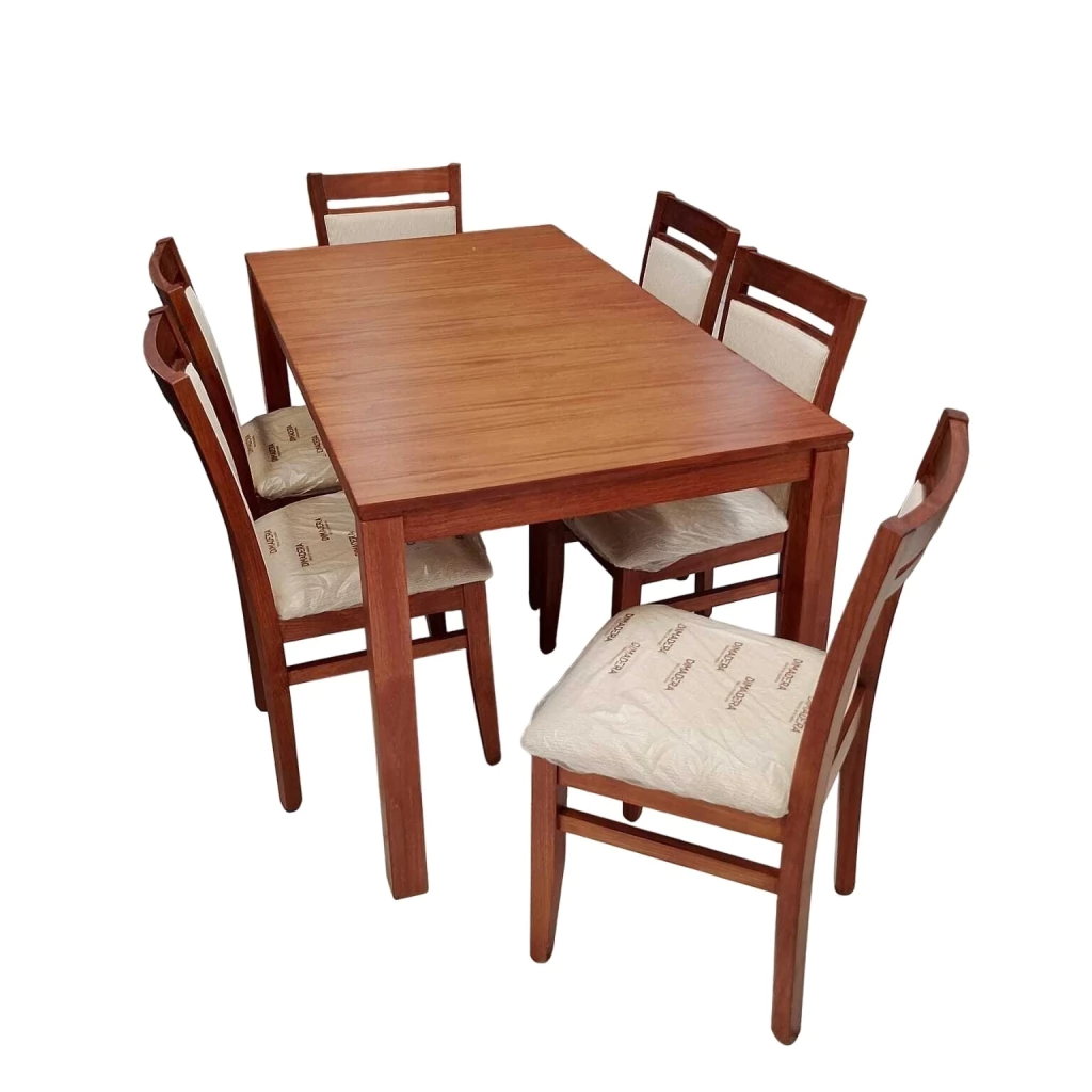 Las seis sillas S206A cuentan con asiento y respaldo tapizados en cuerotex color beig, brindando comodidad y estilo en cada encuentro familiar o reunión con amigos. Las dimensiones de cada silla (46x91x56 cm) aseguran un confort ideal para largas charlas y comidas.