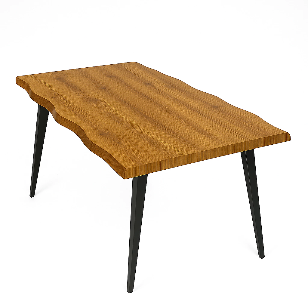 Transformá tu espacio con esta mesa de comedor rectangular de 130x80 cm, fabricada en MDF color marrón con bordes irregulares que aportan un detalle único y moderno. Su tapa robusta y elegante se combina perfectamente con las patas metálicas negras, que brindan estabilidad y un estilo contemporáneo ideal para cualquier ambiente.