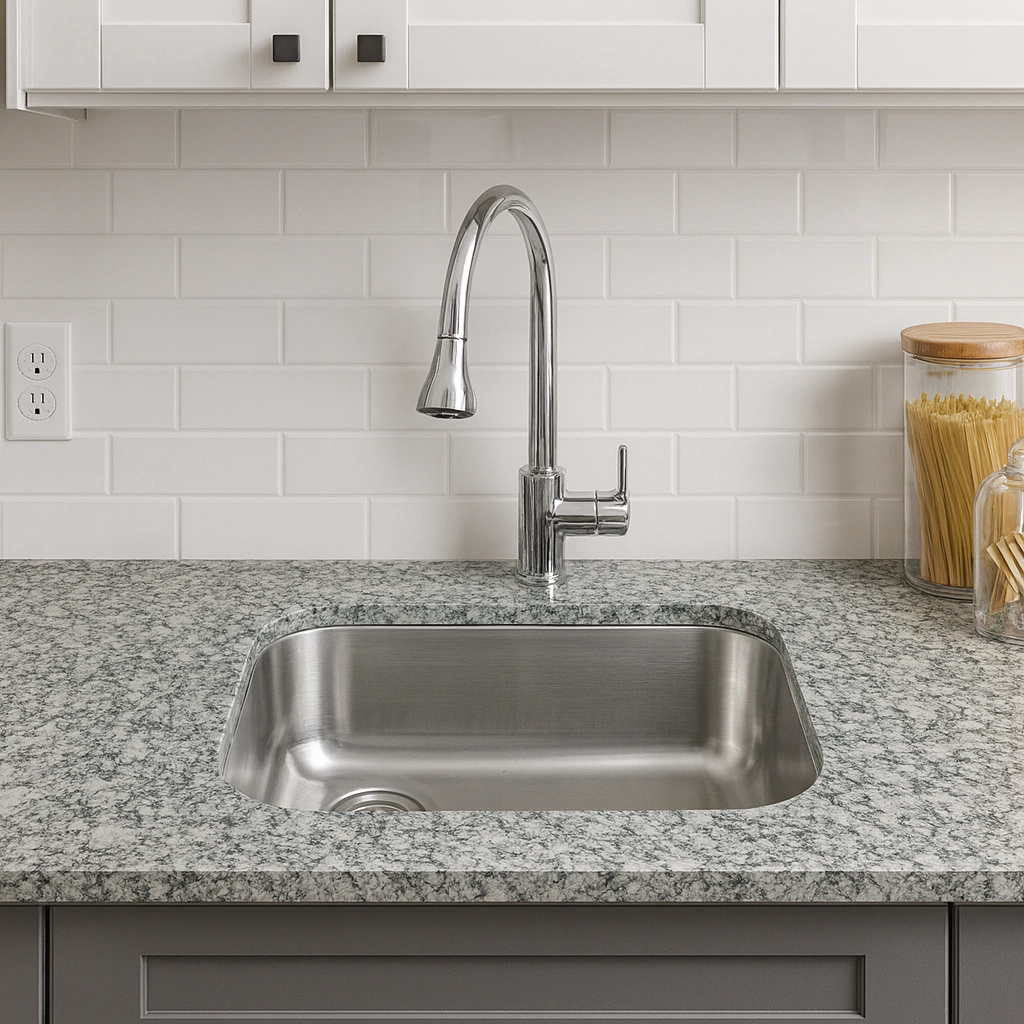 La calidad del granito natural garantiza durabilidad y fácil mantenimiento, mientras que el color gris aporta un toque moderno y luminoso. Ideal para quienes buscan un equilibrio entre estética y practicidad en la cocina.