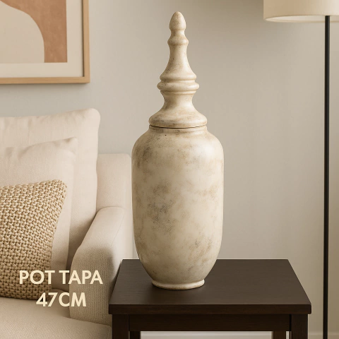 Este jarrón decorativo de 47 cm con tapa ornamentada es una pieza protagonista que eleva cualquier ambiente. Su acabado artesanal en tonos neutros, con textura envejecida y forma estilizada, lo convierte en el complemento ideal para livings, halls o muebles de recibidor.