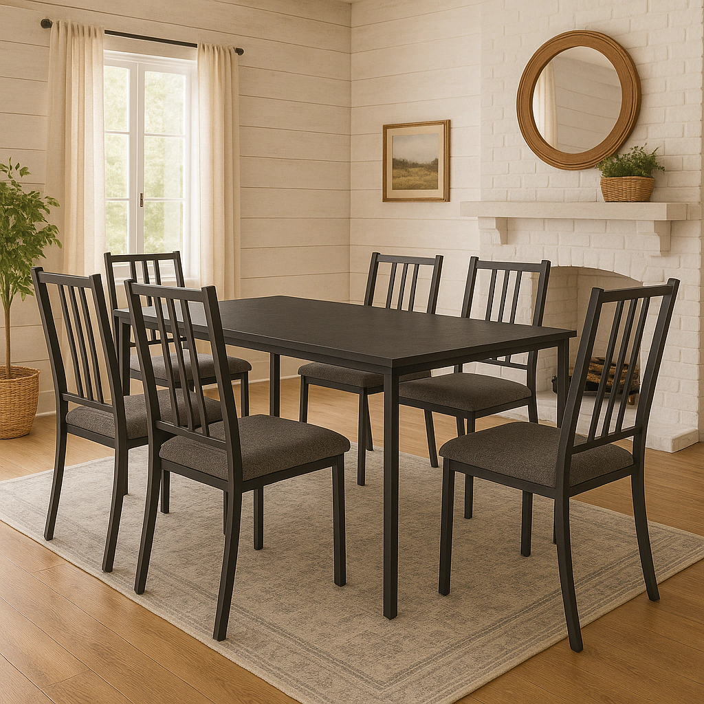 El asiento tapizado en telas vaídas aporta un toque rústico y confortable, ideal para largas reuniones familiares o cenas con amigos. Además, su diseño ergonómico asegura comodidad y estabilidad en cada uso.